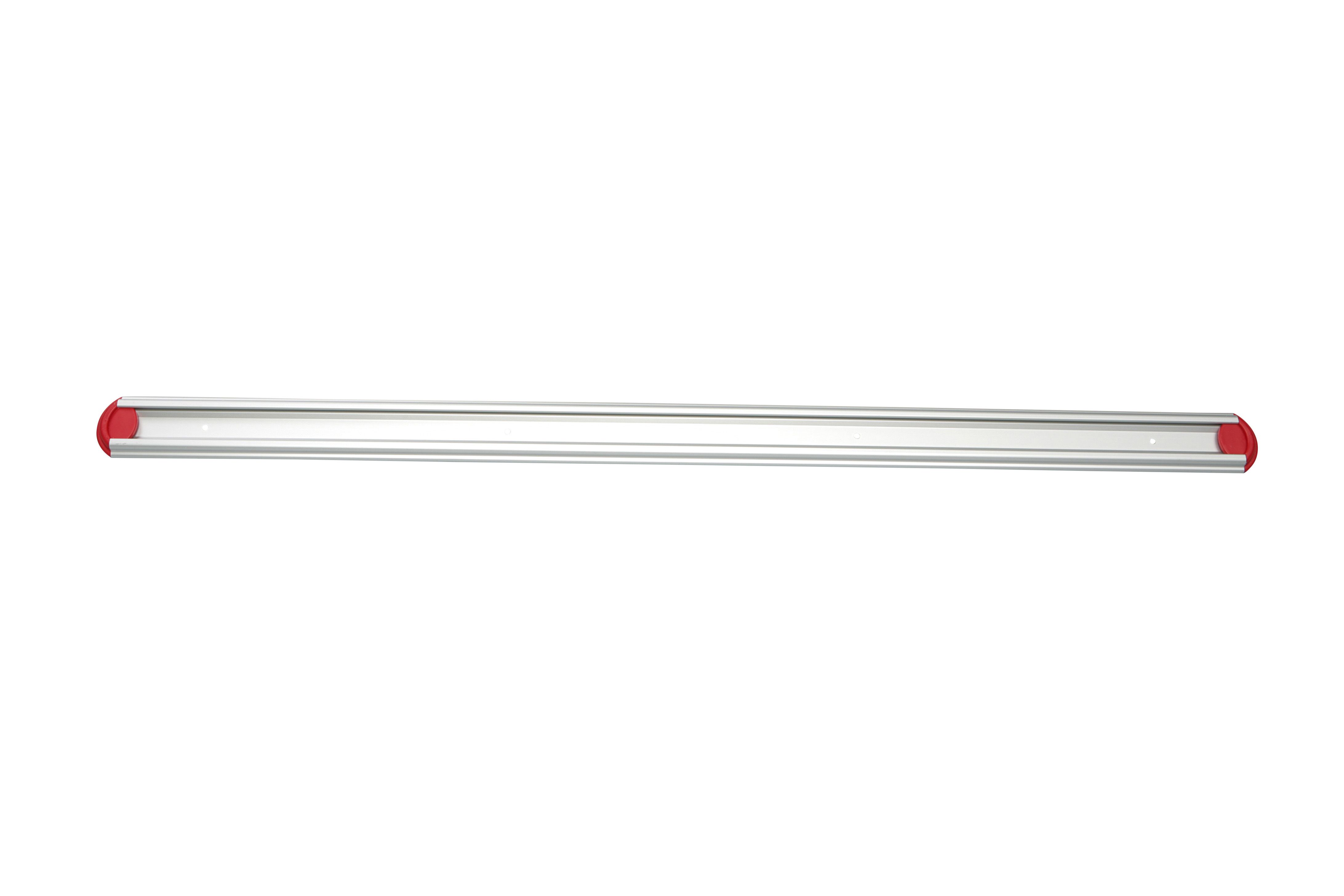 Een wandstrip van 90 cm met rode uiteinden, geschikt voor ophanghaakjes en 5 steelklemmen of een combinatie.